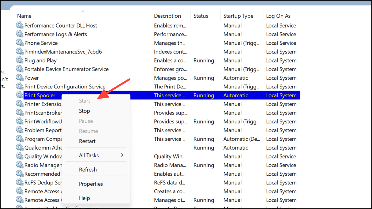 3. lépés:Visszatérés a Szolgáltatások ablakba, kattintson a jobb gombbalNyomtatott spooler, és válassza kiStart