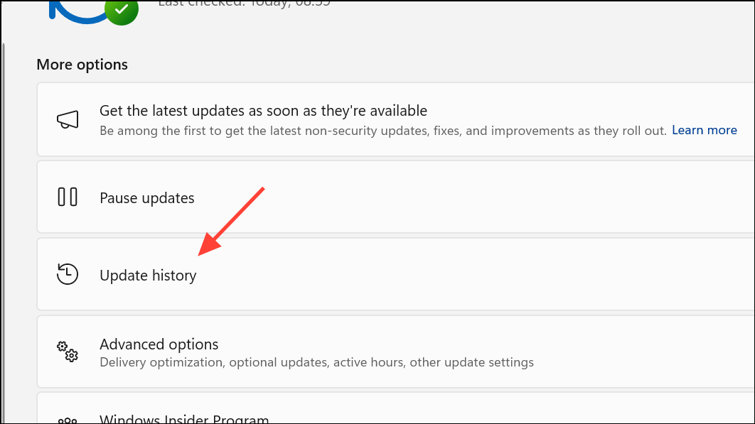 1. lépés:ElindulIndítás> Beállítások> Windows UPDATE> Az előzmények frissítése- Azonosítsa a legfrissebb frissítést a hiba kezdete előtt.