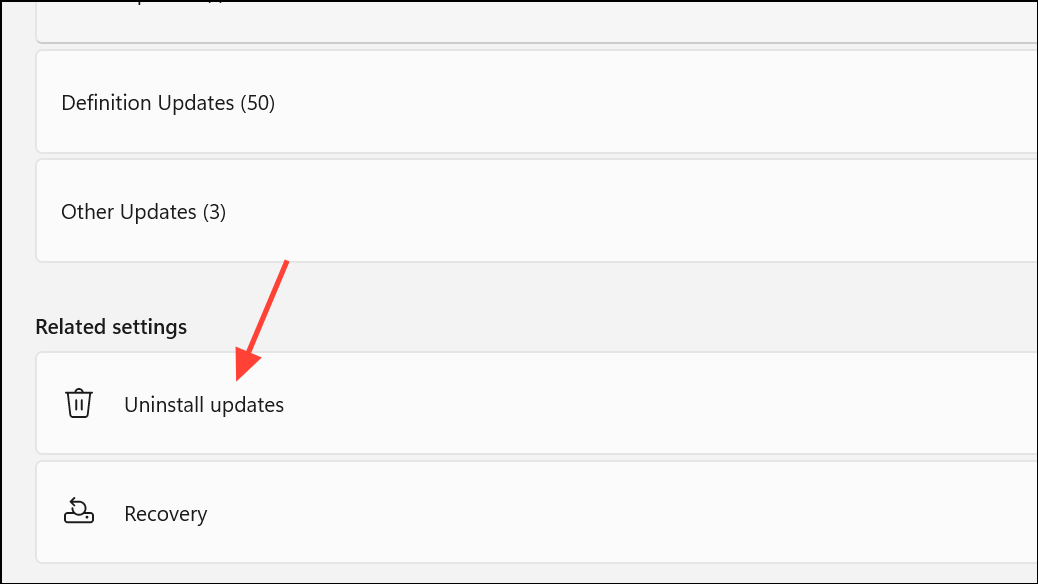 2. lépés:Görgessen le és válassza kiTávolítsa el a frissítéseketa kapcsolódó beállítások alatt. Keresse meg a frissítést a KB számával, és válassza kiEltávolít-