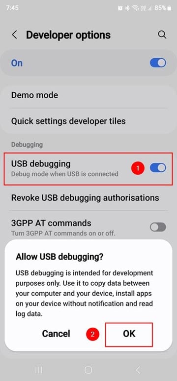- Engedélyezze az USB hibakeresését az Android készüléken.