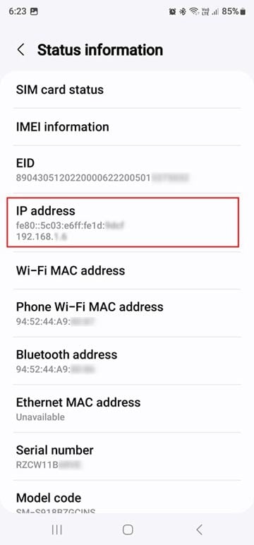 - ElindulBeállítások> A telefonról> Állapotinformációkés jegyezze fel aIP -címAndroid készüléke.