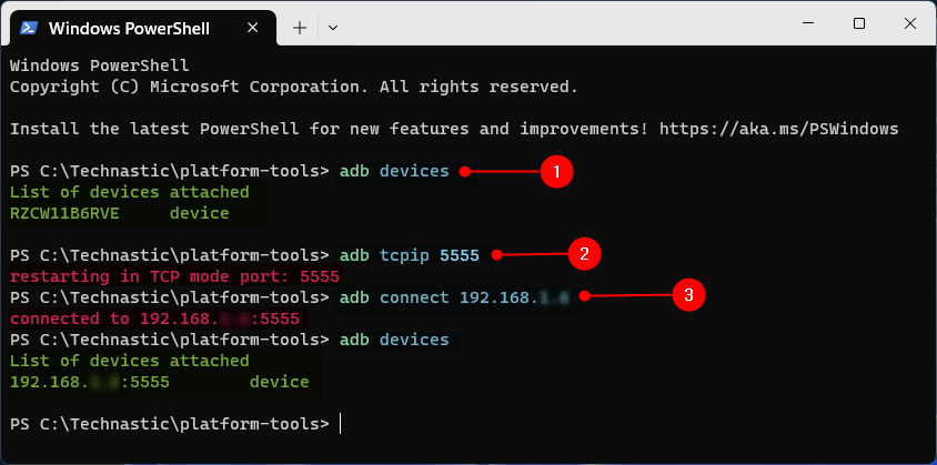 - Az ADB csatlakozik a telefon IP -címéhez.