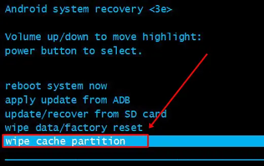 2. Käytä äänenvoimakkuuspainikettaPääsypyyhi välimuistin osioja valitse se sitten vaihtoehto ja painamalla virta -painiketta.