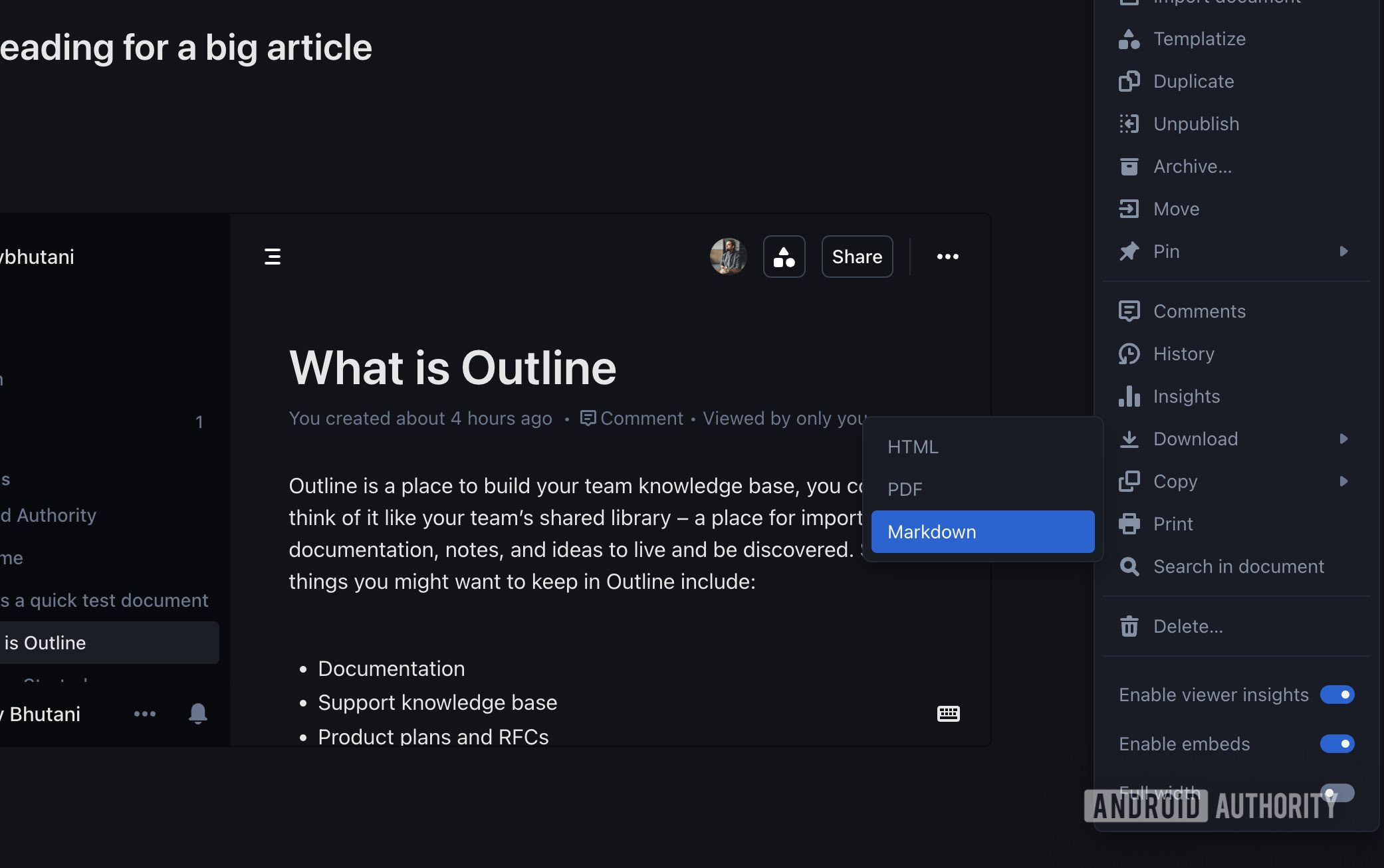 Tässä huomautuksessa ääriviivat on vielä yksi ominaisuus, joka vetoaa minuun. Tietojen omistaminen ei ole mitään ilman helppoa tiedonsiirtoa. Avoimen lähdekoodin sovellukset voivat myös lopettaa kehityksen. Jos olet yrittänyt viedä asiakirjoja Google Keep- tai OneNote -asiakirjoista, tiedät kuinka hankala se voi olla. Vientivaihtoehdot ovat rajalliset, ja asiakirjan rakenne on hankala suunnittelussa, mikä vaikeuttaa näiden asiakirjojen siirtämistä toiseen sovellukseen.