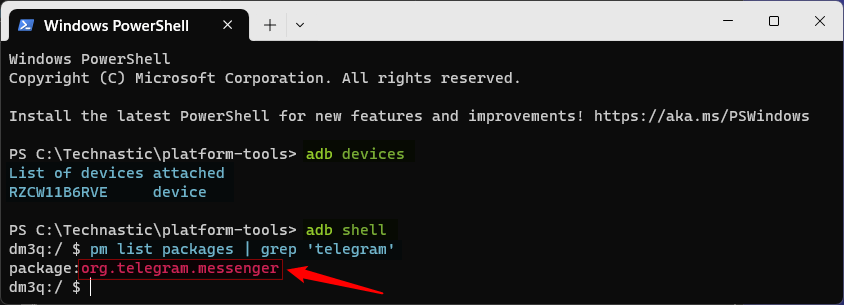 pm list packages | grep '<app-name>' Example: pm list packages | grep 'telegram'