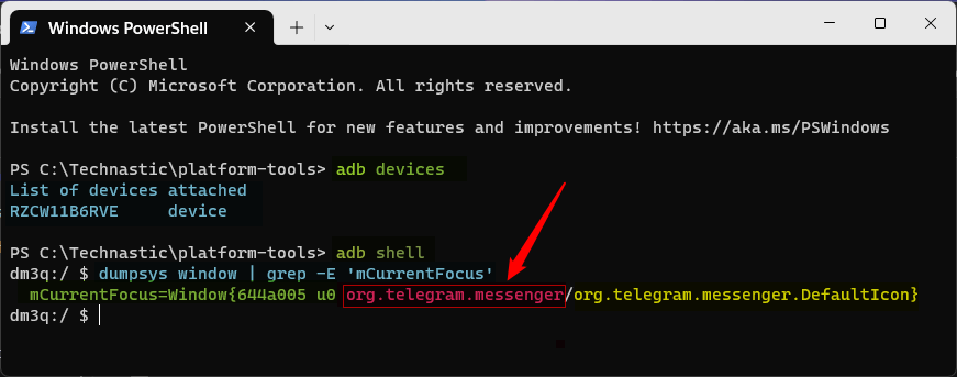 - Heti kun painat Enter, ADB saa sovelluksen sovelluksen nimen, joka on tällä hetkellä avoinna Android -puhelimellasi. Minun tapauksessani avasin puhelinlaitteeni.