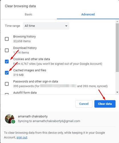 Jos Google Chrome näyttää edelleen RESULT_CODE_HUNG-virheen, on suositeltavaa tyhjentää selaimen välimuisti ja tiedot. Selaimen välimuistin ja tietojen tyhjentäminen sulkee pois vioittuneet välimuistit ja tyhjentää kaikki tallennetut tiedot.