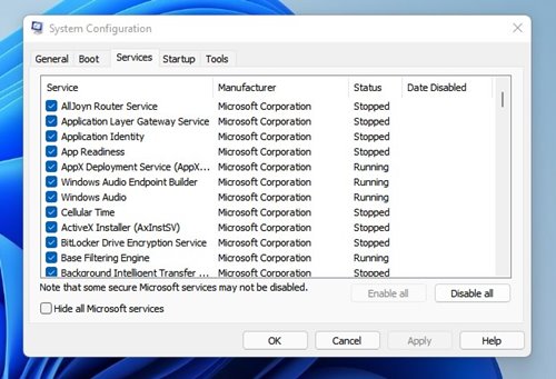 3. TarkistaPiilota kaikki Microsoft -palvelutValintaruutu ja napsautaPoista kaikki käytöstä.