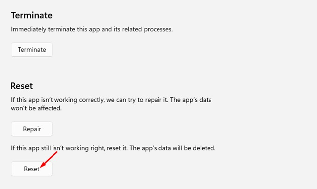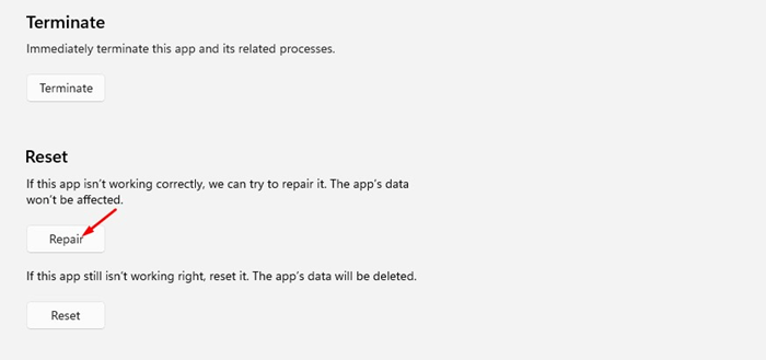 Koska Notepad on alkuperäinen sovellus, voit korjata tai nollata sen, jos se ei toimi.