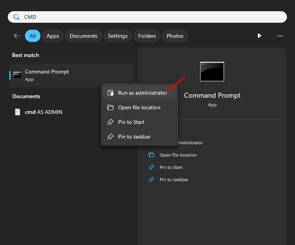 1. Kirjoita komentokehote Windows 11 -haussa. Napsauta hiiren kakkospainikkeellaCmdsovellus ja valitseJärjestelmänvalvojana.