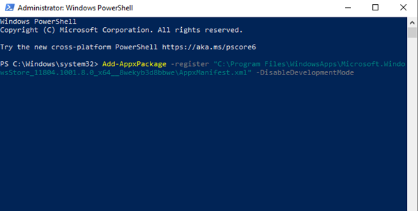 Add-AppxPackage -register “C:Program FilesWindowsAppsMicrosoft.WindowsStore_11804.1001.8.0_x64__8wekyb3d8bbweAppxManifest.xml” –DisableDevelopmentMode