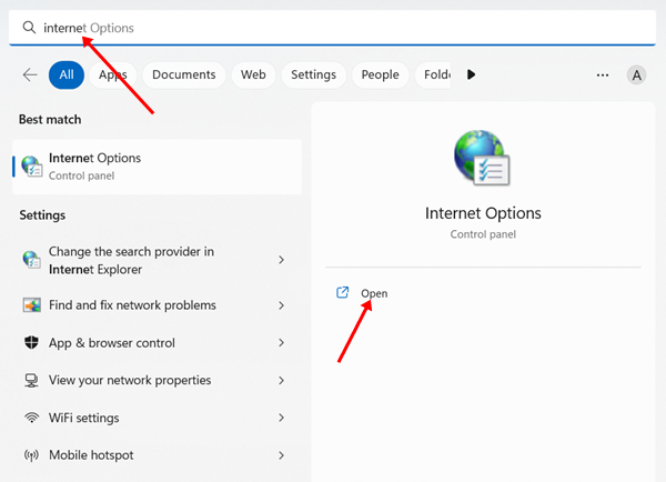1. PainostaaWindows>etsiäInternet -vaihtoehdot>napsauttaaAvata.