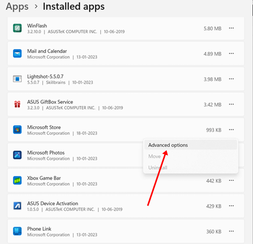3. Kaikista sovelluksista löytyyMicrosoft Store, napsautakolme pistettäja valitseEdistyneitä vaihtoehtoja.