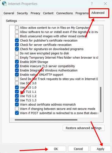 2. Nyt suuntaaAdvances -välilehti. Ja tarkistamatta laatikkoaKäytä TLS 1.2.