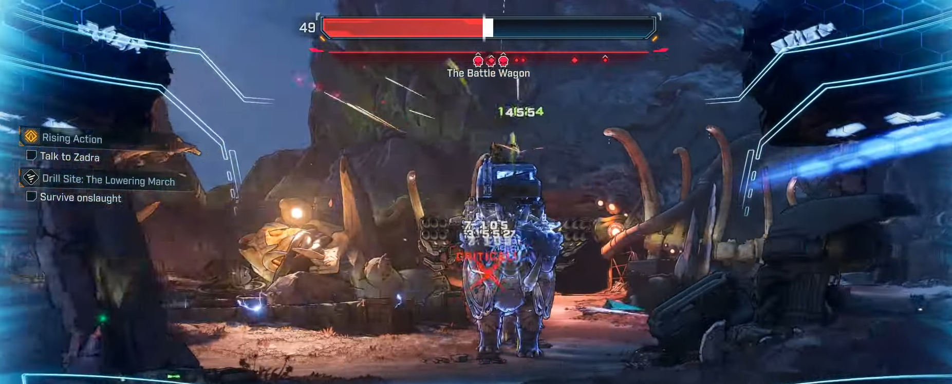 Taistelun edetessä taisteluvaunu voi pudota polvilleen, kutistaa lisää vihollisia pomon yläpuolella. Näiden voittaminen tarjoaa edelleen ryöstö- ja XP -voittoja.