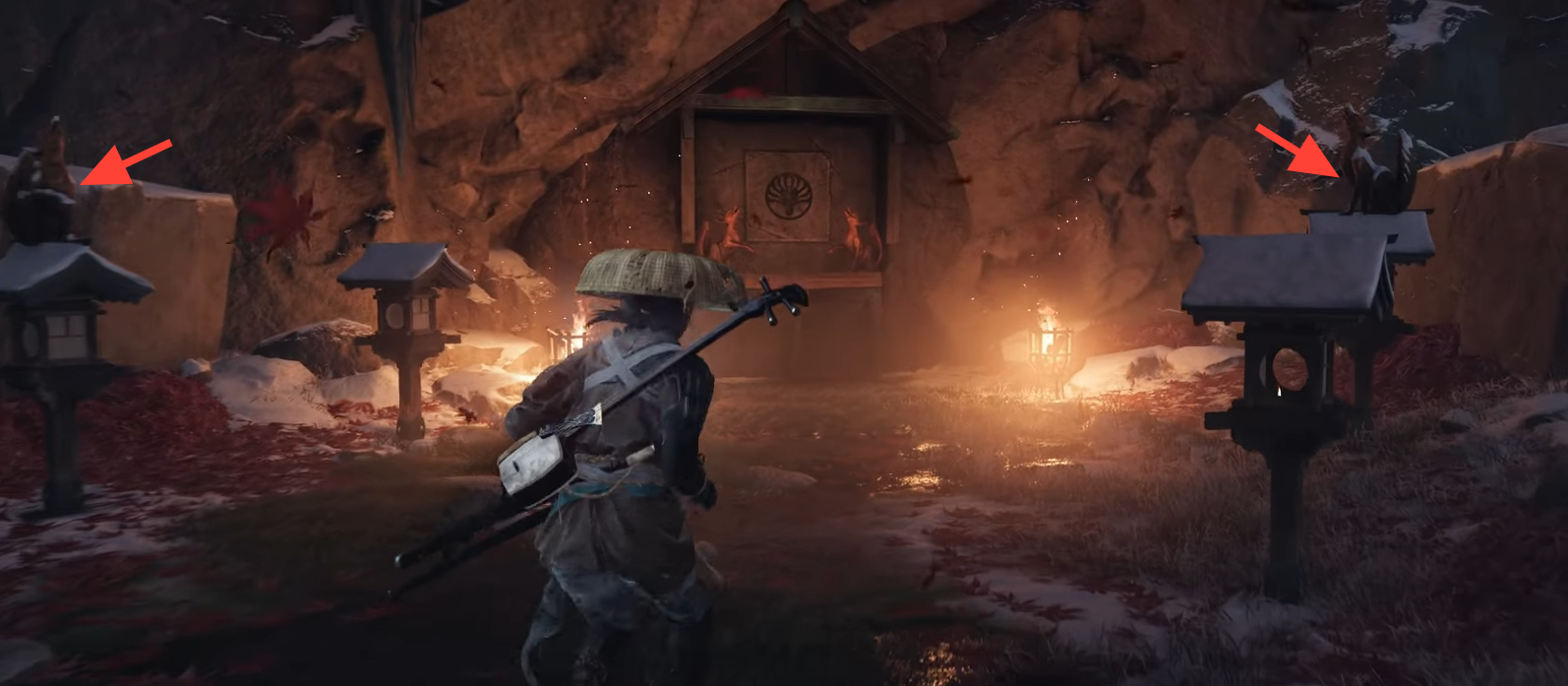 Kaksi Fox -patsasta reunustavat sisäänkäyntiä; Valosta kaksi lyhtyä kettujen kanssa päällä avataksesi piilotetun kulku.