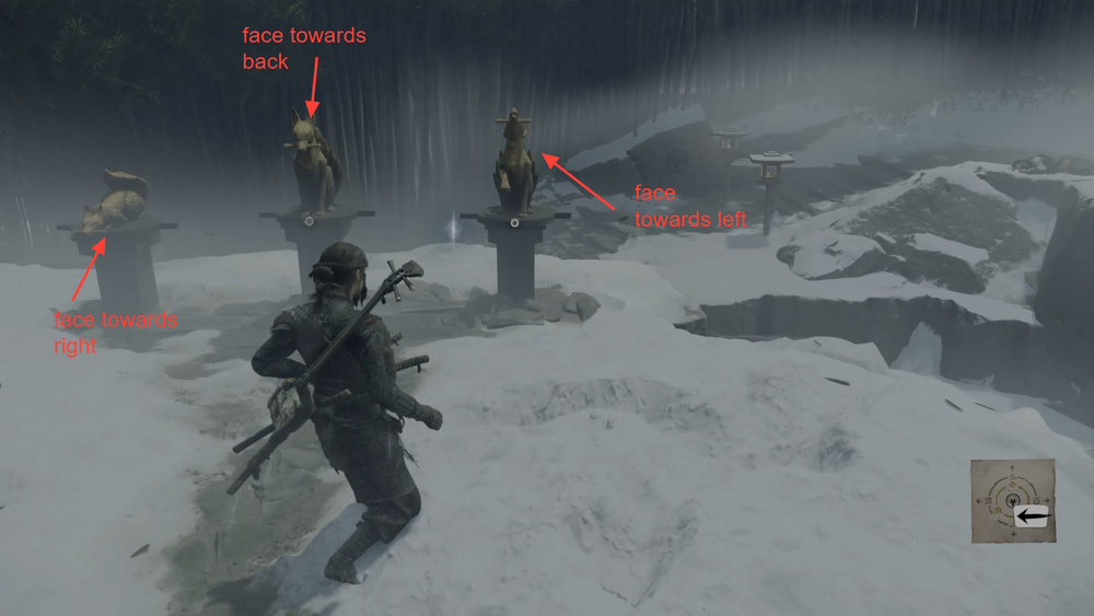 Koko Kitsune -kaarin ajan kohtaat usein Fox -patsaita, jotka on asetettu palapeliksi keskeisissä kertomusristeyksissä. Nämä patsaat upotetaan usein pyhäkköihin, lukittuihin oviin, siltoihin ja jopa luoliin, mikä heijastaa Kitsunen huijari -luonnetta ja hänen kykyään pettää tunkeilijoita. Jos patsas käännetään väärin - tai jos tiettyjä ”kuoleman” symboleja ei oteta huomioon - pelaajat voivat laukaista piilotetut ansat tai taisteluja yhdeksällä pyrstöllä Shinobilla sen sijaan, että avaa polun eteenpäin