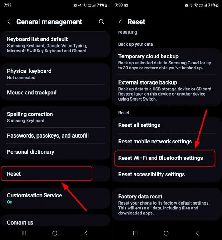 Jos Android Auto ei muodosta yhteyttä Bluetoothin kautta, harkitse Bluetooth- ja Wi-Fi-asetusten palauttamista Android-laitteessa ja aloita uudelleen. Tämä poistaa kaikki Wi-Fi-verkot ja parilliset Bluetooth-laitteet, mutta saattaa olla tarpeen päivittää yhteysasetukset kokonaan.