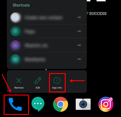 Joten et vieläkään pysty ratkaisemaan asiaa? Älä huoli! Voit yksinkertaisesti asentaa puhelinsovelluksen uudelleen Android -älypuhelimeesi. Jos haluat tehdä niin, napauta ja pidä kiinni puhelinsovelluksesta, ja sitten ponnahdusvalikosta valitseAsennuksen poistaminentaiVoimapysäkkipainike. Sen jälkeen käynnistä laite uudelleen ja asenna puhelinsovellus uudelleen, tarkista sitten, onko ongelma ratkaistu.