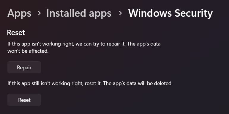Voit myös nollata järjestelmän Windows Security -sovelluksen muistin eheysongelman ratkaisemiseksi. Joskus Windows Security -sovellus aiheuttaa myös ongelmia muistin eheysominaisuuden kytkemiseen päälle. Se voi tapahtua useista syistä. Siten sinun on noudatettava vaiheita, jotka on lueteltu tietokoneesi suojaussovelluksen nollaamiseksi.