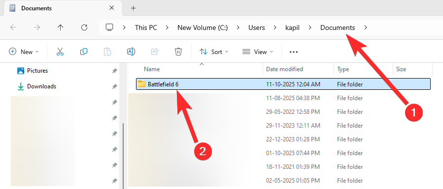 Siirry tietokoneen 'Documents' -kansioon ja varmuuskopioi Battlefield 6 -kansiosi. Nimeä Battlefield 6 -kansio uudelleen palautetun asetuksen palauttamiseksi (tämä voi korjata kokoonpanoihin liittyvät kaatumiset, mutta saatat menettää tallennetun pelin edistymisen).
