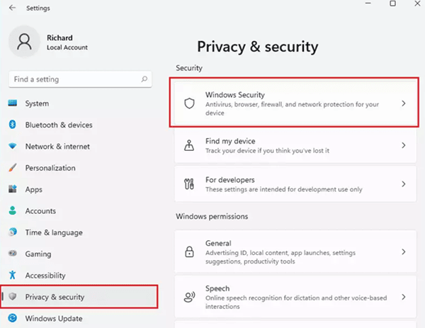 2. Sen jälkeen vaihdaYksityisyys ja turvallisuusvälilehti. Valitse sittenWindows Securitylaatta.