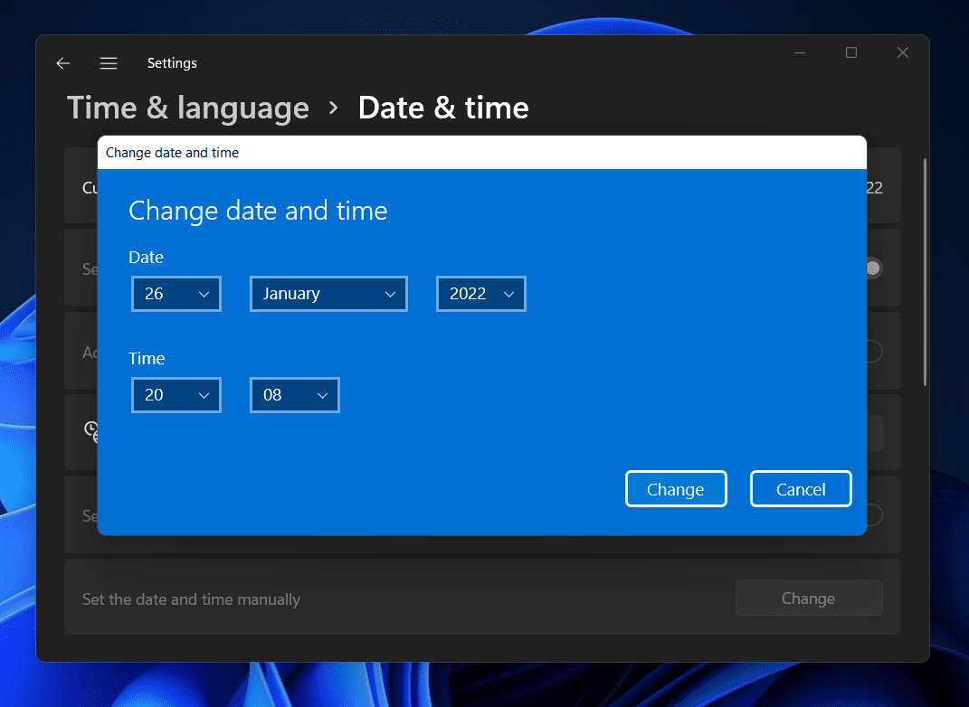 - Jos haluat muuttaa ajan manuaalisesti, napsautaMuuttaapainike. Seuraavalla sivulla sinua pyydetään asettamaan päivämäärä ja aika. Kun olet valmis, napsautaMuuttaaJa sinulla on hyvä mennä.
