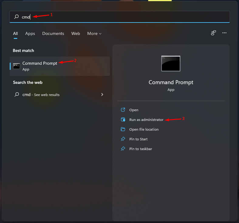 - PainaIkkunatavain avataKäynnistä valikko.SiinäKäynnistä valikko,etsiä jtkCmd.Napsauta hiiren kakkospainikkeellaKomentokehotusja napsauta sittenSuorita järjestelmänvalvojana.