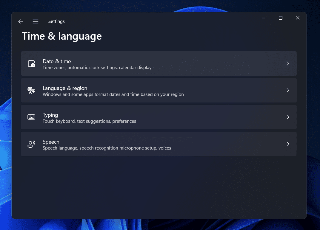- SiinäAsetuksetsovellus, siirryAika ja kieliosa vasemmasta sivupalkista.