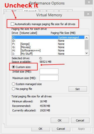 7. Löydät oletusasetuksenhallita automaattisesti kaikkien asemien hakutiedoston kokoa;Poista se valinta. Seuraavaksi sinun on valittava osio ja valittava sittenräätälöity kokovaihtoehto.
