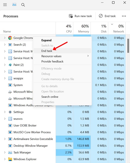 4. Jos et halua tiettyä sovellusta yhteydenottoon Internetiin, napsauta hiiren kakkospainikkeella sovelluksen nimeä ja valitsePäätehtävä.