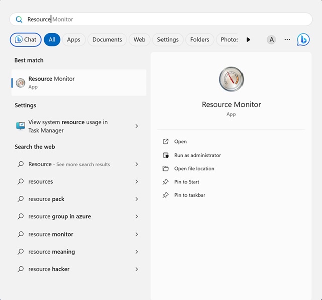 1. Avaa Resource Monitor -sovellus Windows 11 -haussa.