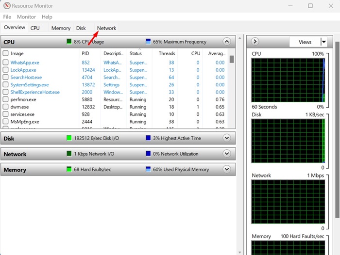 2. Kun resurssimonitori aukeaa, vaihdaVerkko.