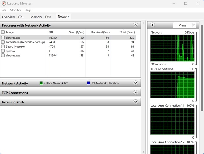 Resource Monitor on Windowsille saatavana oleva Task Manager -sovelluksen edistynyt versio. Voit käyttää sitä tarkistaaksesi, mitkä sovellukset käyttävät Internetiä.