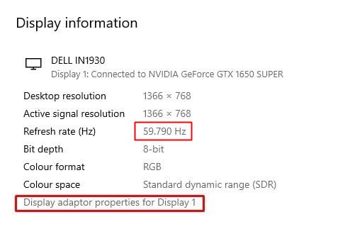 5. Valitse näyttö avattavasta ja tarkistaTyöpöytätilateksti. Lopussa näkyvä kuva on näytön virkistysnopeus.