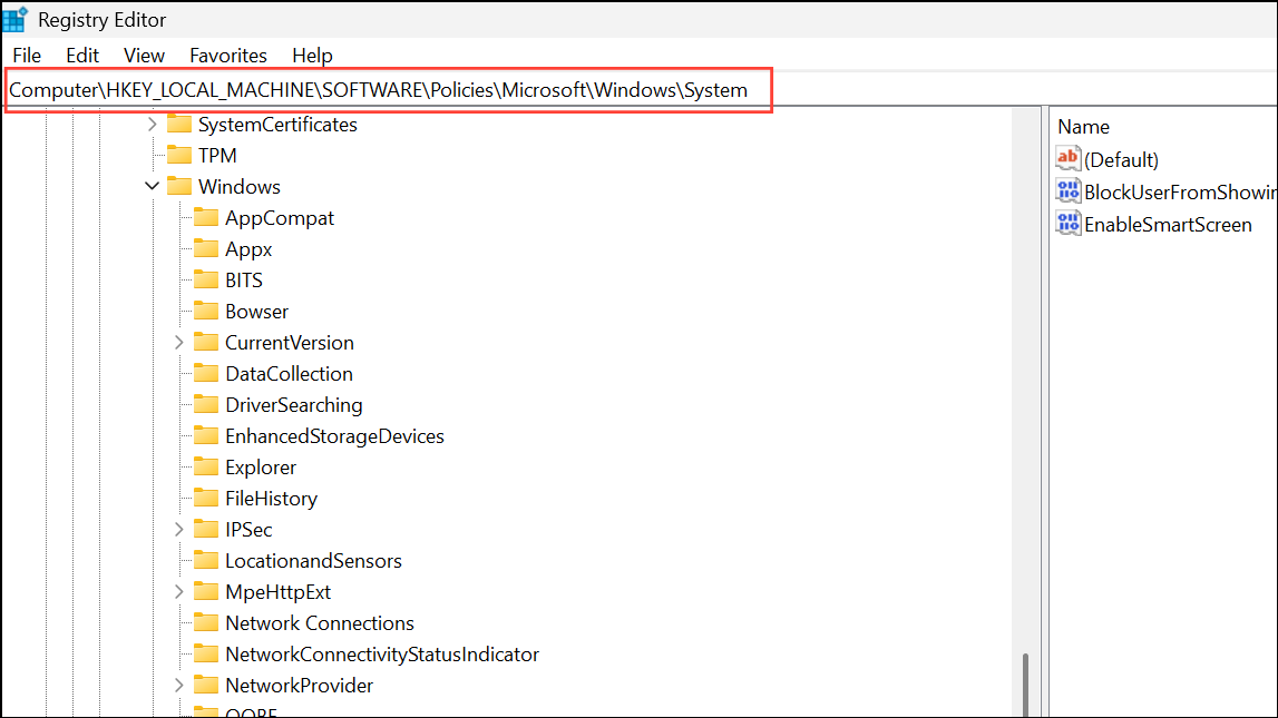 Vaihe 2:Siirtyä jhkHKEY_LOCAL_MACHINESOFTWAREPoliciesMicrosoftWindowsSystem. Jos järjestelmäavainta ei ole, luo se hiiren kakkospainikkeella ja valitsemallaUusi> avain.