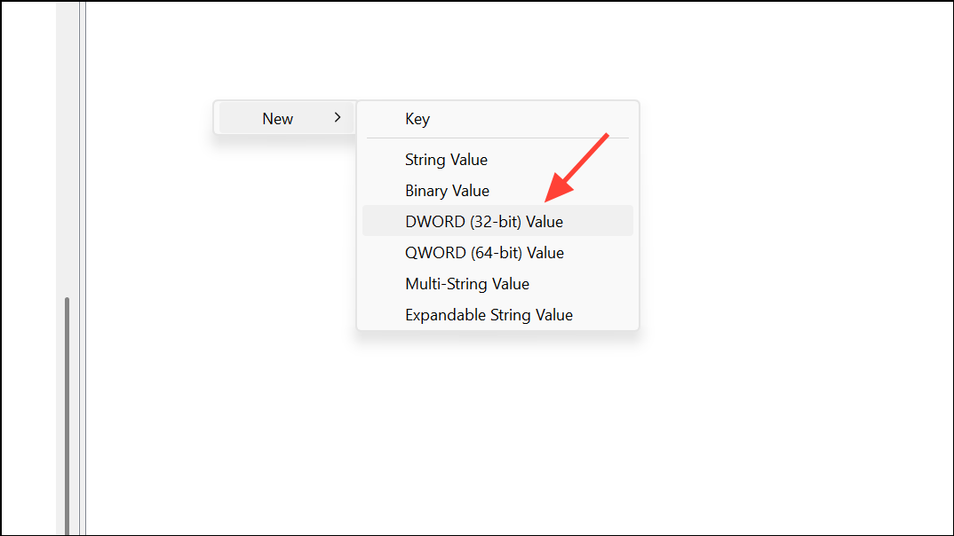 Vaihe 3:Napsauta hiiren kakkospainikkeella oikeaa ruudua, valitse uusi> dword (32-bittinen) arvo ja nimeä sePublishUserActivities.