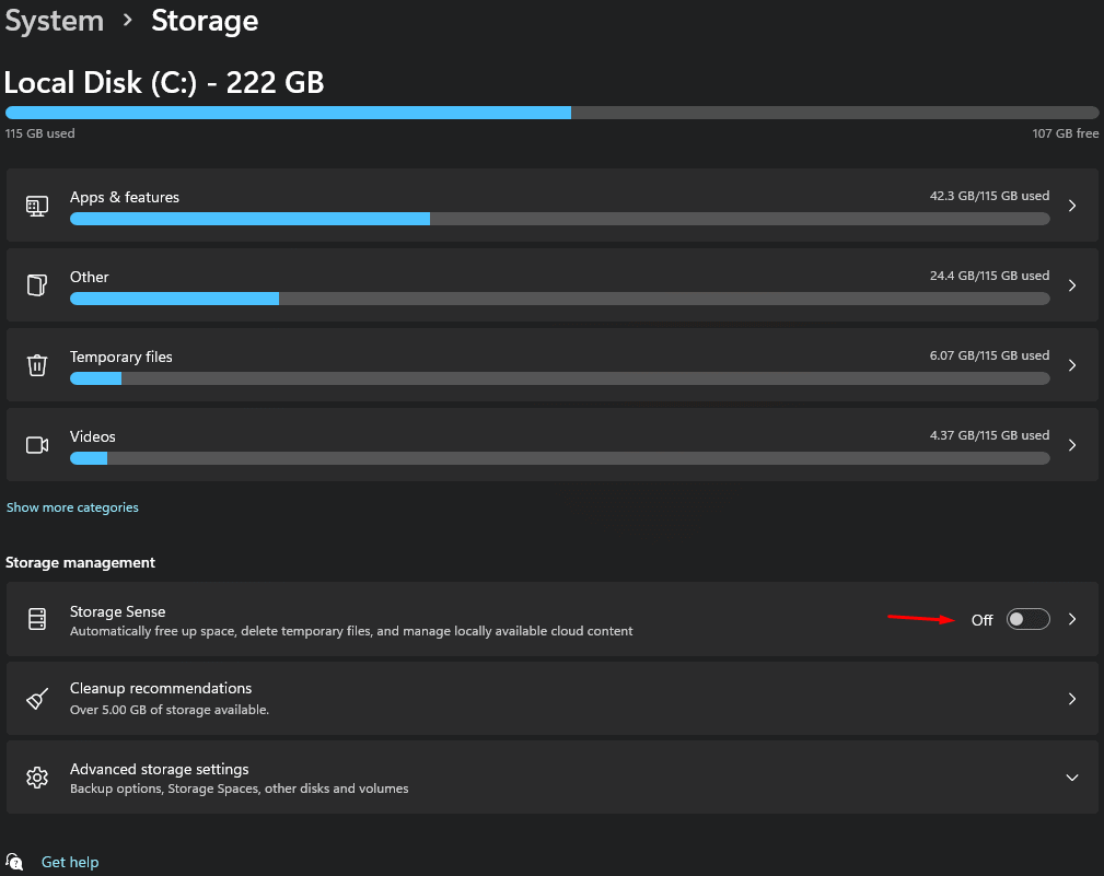 - Napsauttaa"Storage Sense"Varastoinnin hallinnassa.