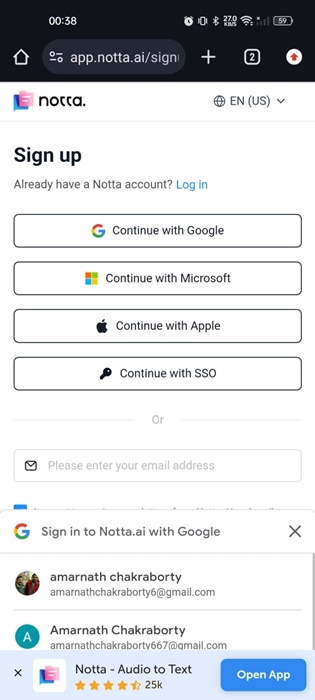2. Sinun on rekisteröidyttävä Google-tilillä. Luo tili Notta.ai:lle käyttääksesi sen palveluita.