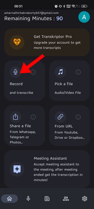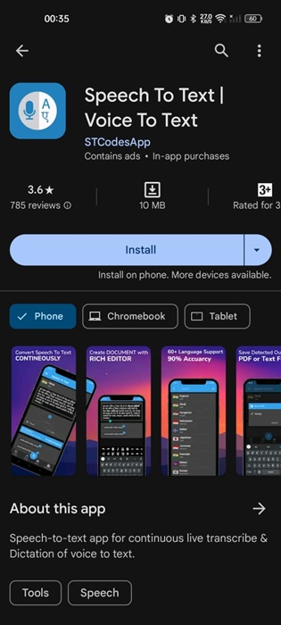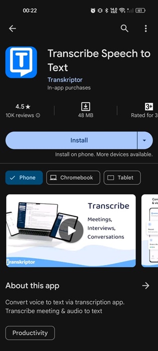 Transkriptor on kolmannen osapuolen Android-sovellus, joka muuntaa puheen tekstiksi. Sen voi ladata ilmaiseksi Google Play Kaupasta.