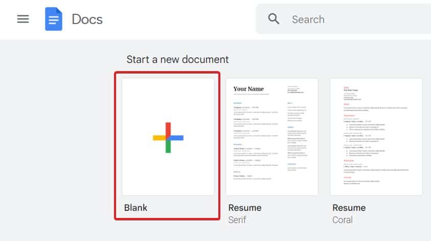 Ensinnäkin, sinun on avattava Google -dokumentti -asiakirja, jossa haluat tehdä ripustettavan sisennän. Tiedät jo, kuinka avata se, mutta siirry tuntemattomille osoitteeseen docs.google.com ja napsauta tyhjää avataksesi uuden asiakirjan. Voit myös löytää ja avata vanhan asiakirjan, josta haluat tehdä ripustettavan.