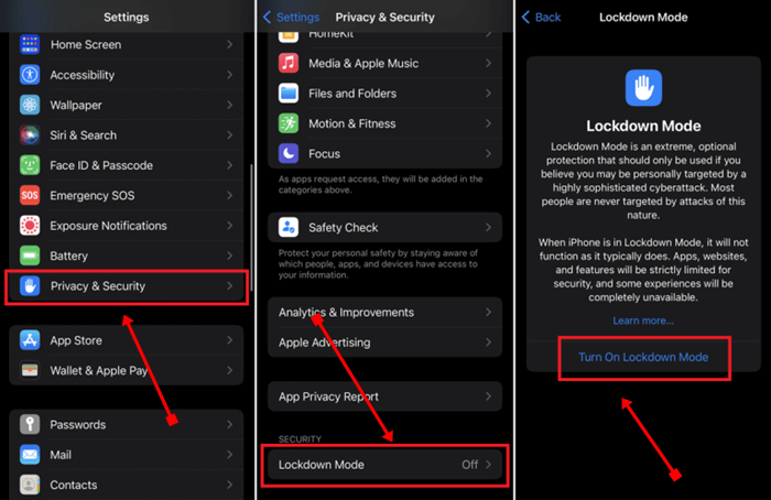 Jos uskot, että iPhonessa on vakoiluohjelmia ja edellä mainitut menetelmät eivät ole tyydyttäviä, voit ottaa käyttöön lukitustilan, joka on erityisesti suunniteltu suojaamaan laitetta tietohyökkäyksiltä. Jos iOS -versio on vähintään 16, noudata alla olevia vaiheita: