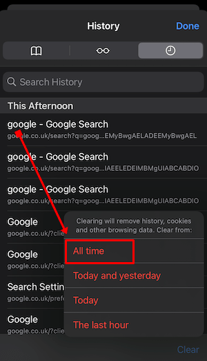 3. Se kehottaa sinua valitsemaan ajanjakson vain napautaKoko ajan, ja tämä poistaa kaikki selaimen historian, evästeet ja muut tiedot pysyvästi.