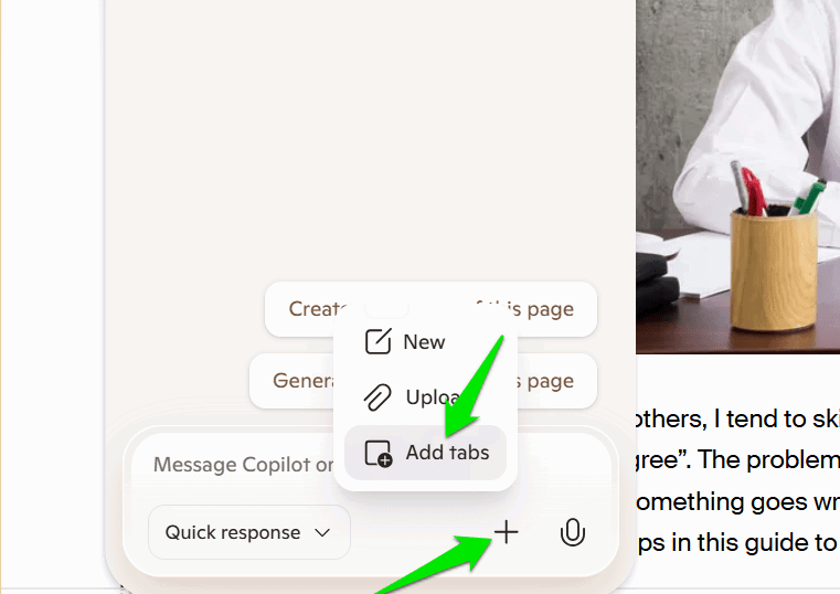 Voit myös pakottaa Copilotin rajoittamaan vastauksensa tiettyihin välilehtiin, jotta se ei sekoita tietoja muista välilehdistä. Napsauta niin+ (Plus) -kuvakenopeassa avustuksessa ja valitseLisää välilehtiä. Voit sitten valita luettelon välilehtiä ja kysyä niistä.