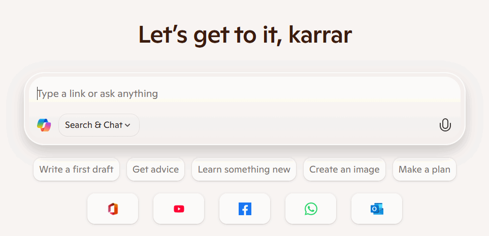 Jos haluat käyttää Copilot -tilaa, sinun on vain avattava uusi välilehti tai päivitettävä se. Se korvaa tavanomaisen hakukentän kopilotilla uudellaHaku ja chattila. Tässä tilassa Copilot yrittää automaattisesti ymmärtää hakukyselysi päättääksesi, pitäisikö sen vastata siihen vai etsiä sitä Bingin avulla.