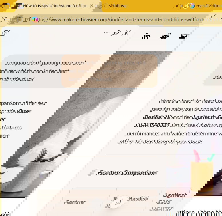 Tämä ei vain auta saamaan vastauksia kaikista välilehdistä yhdessä paikassa, vaan se vastaa myös kysymyksiin, joissa kaikki välilehdet ovat yhteydessä. Tämä tarkoittaa, että voit verrata tietoja useiden välilehtien kautta tai tiivistää sisältöä välilehdet yhdessä käyttöliittymässä. Esimerkiksi, jos sinulla on useita reseptejä auki, voit pyytää Copilotia luomaan suuren luettelon kaikista ainesosista, jotka sinun on järjestettävä niiden tekemiseksi.