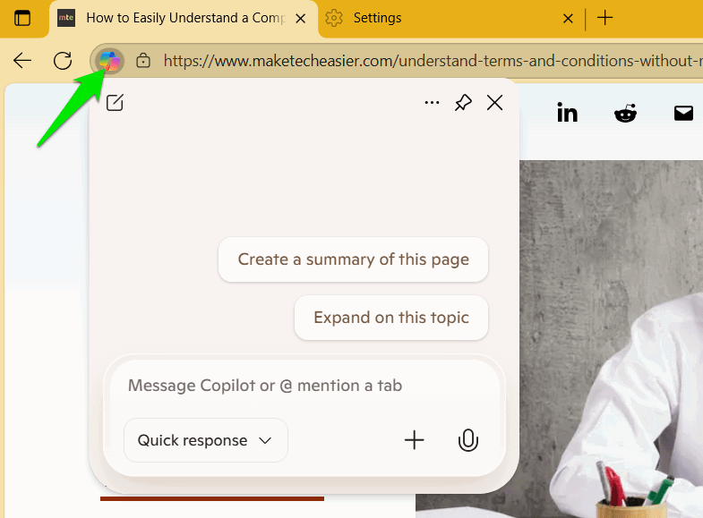 Kun verkkosivu on auki, voit napsauttaa osoitepalkin vasemmalla puolella olevaa Copilot -painiketta avataksesiPika -apupaneeli. Tämän ominaisuuden avulla voit esittää kysymyksiä välilehden sisällöstä, ja vaihtoehdot voidaan tehdä yhteenveto ja laajentaa oletuksena käytettävissä oleva aihe.