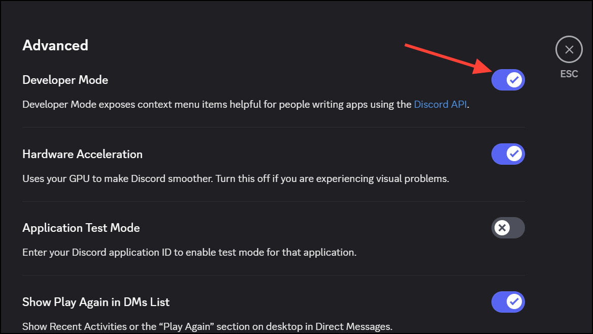 Vaihe 3:LöytääKehittäjätilaVaihda. Napsauta sitä kytkeäksesi kehittäjätilan päälle. Tämä avaa välittömästi kyvyn kopioida palvelimille, kanaville, käyttäjille ja viesteille, mikä on elintärkeää botin kehittämiselle ja discord -sovellusliittymille.