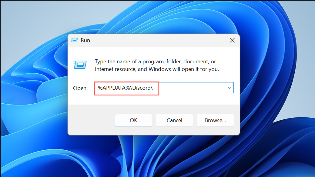 Vaihe 2:PainostaaWIN+Ravata Windows Run -valintaikkuna. Syötä seuraava polku avataksesi Discord -asetuskansiot: