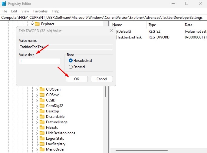 3. KaksoisnapsautaTaskBarendTaskDWORD -arvo.